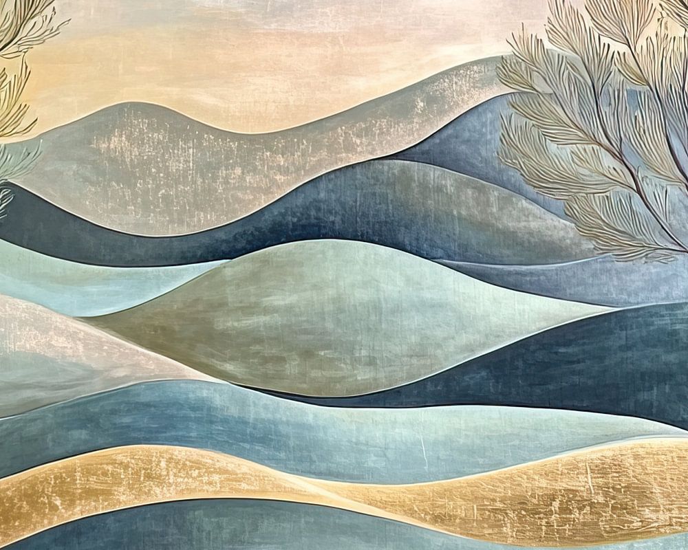 Douces collines et feuilles tranquilles - Cette peinture de paysage montre deux arbres raffinés au premier plan sur un fond de douces collines ondulantes dans une palette de bleu, de vert et d'or, évoquant une atmosphère calme et sereine.