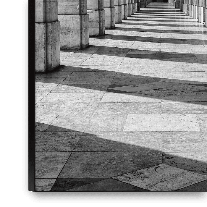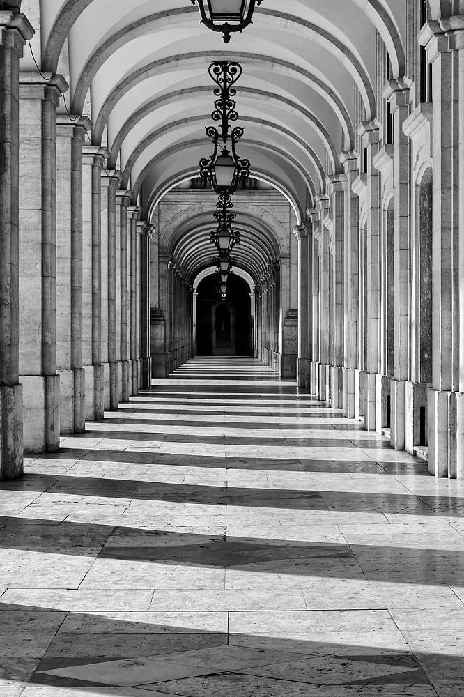 Cette photo en noir et blanc très expressive montre le portique historique de la Rua Augusta au cœur de Lisbonne. La succession strictement symétrique des arcs en pierre, les colonnes massives et les lampes artistiquement conçues créent une profondeur architecturale impressionnante. Des lignes claires et des formes répétitives guident…