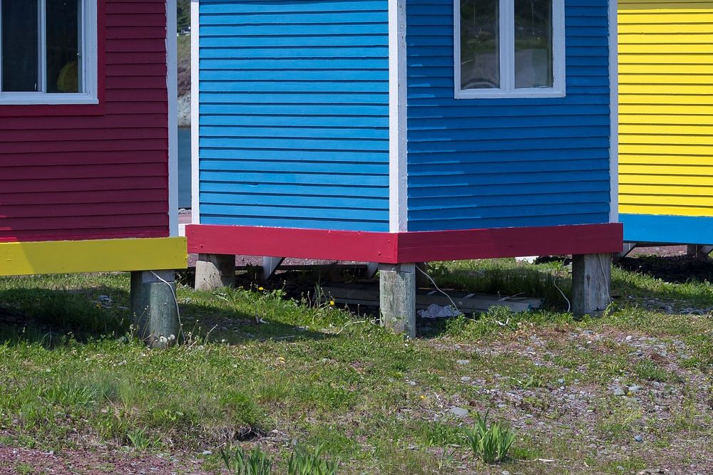 Les célèbres maisons de plage colorées de Cavendish (Terre-Neuve) se dressent sur la plage. Elles surplombent la mer et sont colorées de rouge, de jaune et de bleu.