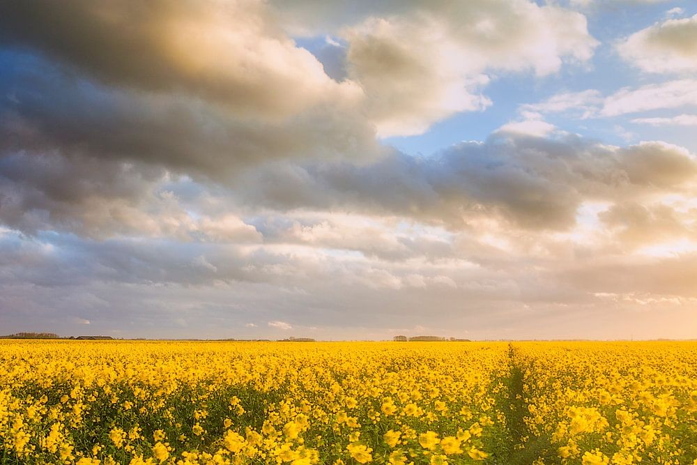 De vastes champs jaunes, avec le vent qui les traverse et le soleil qui descend lentement derrière eux.