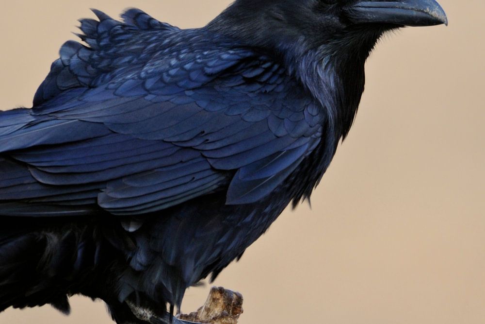 Common Raven / Corbeau freux ( Corvus corax ), adulte impressionnant, perché devant un fond propre, observant attentivement.