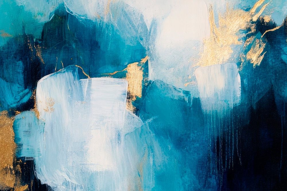 Des tons bleus doux et des accents dorés vifs créent une ambiance harmonieuse qui rappelle l'immensité de la mer. Les formes fluides et le jeu d'ombre et de lumière confèrent à la pièce une élégance apaisante. Idéal pour le salon, il crée une atmosphère accueillante qui invite à la détente.