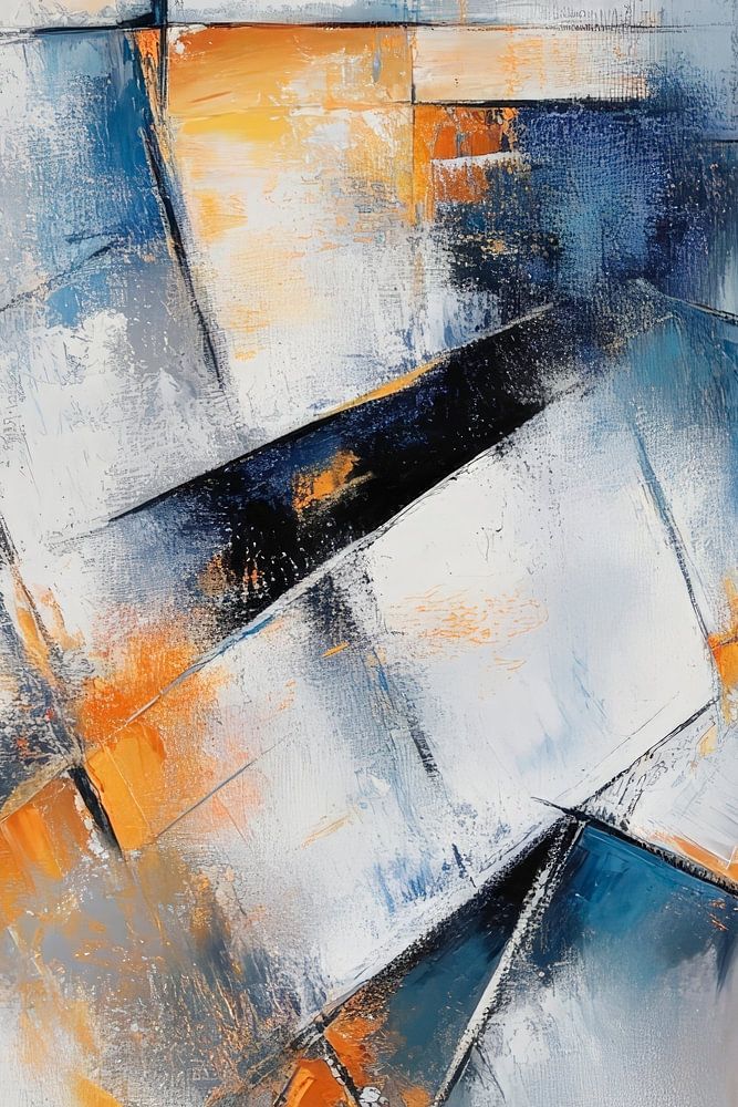 Une composition harmonieuse de tons bleus froids et de nuances dorées chaudes se déploie sur la toile, tandis que des formes géométriques se superposent avec vivacité dans la profondeur. Cette abstraction dynamique apporte une sensation de mouvement et d'énergie dans chaque pièce. Idéal dans un salon moderne ou un bureau créatif pour favoriser l'inspiration et le style.