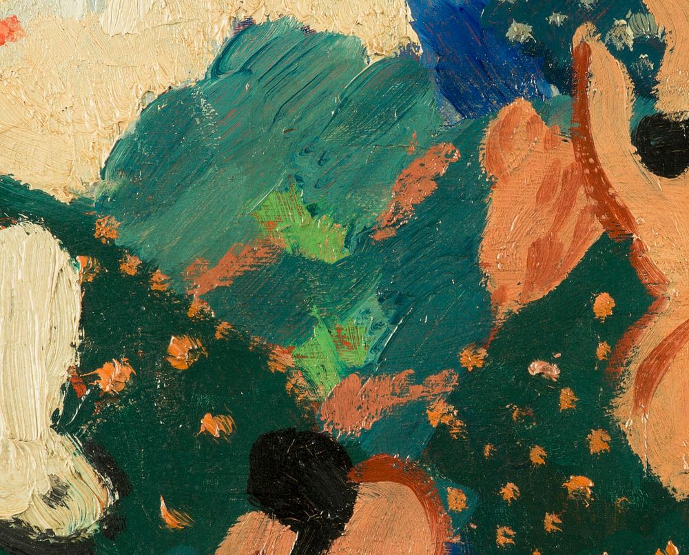 La mort de Paul Cézanne en 1906 conduit André Derain à poursuivre un sujet privilégié par le dernier des grands post-impressionnistes : les baigneurs dans un paysage idyllique. Dans cette petite huile, Derain divise son petit paysage en deux parcelles de terre en pente, vert forêt, parsemées de traits de couleur agrume, qui entourent l'embouchure d'un profond fleuve ultramarin. Les baigneuses apparaissent dans différents états de déshabillage, avec une silhouette particulièrement incurvée qui se détourne du spectateur alors que ses épais cheveux de corbeau tombent juste au-dessus de sa taille. Un vibrant éventail de blancs aide à relier cet espace presque mythique.