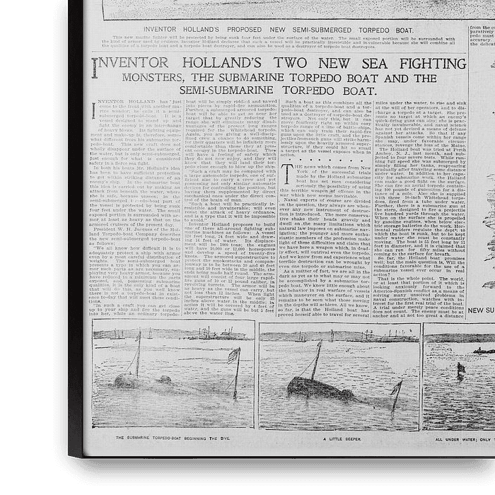 A quoi devrait ressembler un sous-marin selon l'inventeur Holland. Ce journal approfondit l'architecture de la destruction des navires de guerre à l'aide d'un sous-marin. Bien visibles, la bataille navale, le canon ou la mitrailleuse, les marins et les autres marins et la guerre qui se déroule.