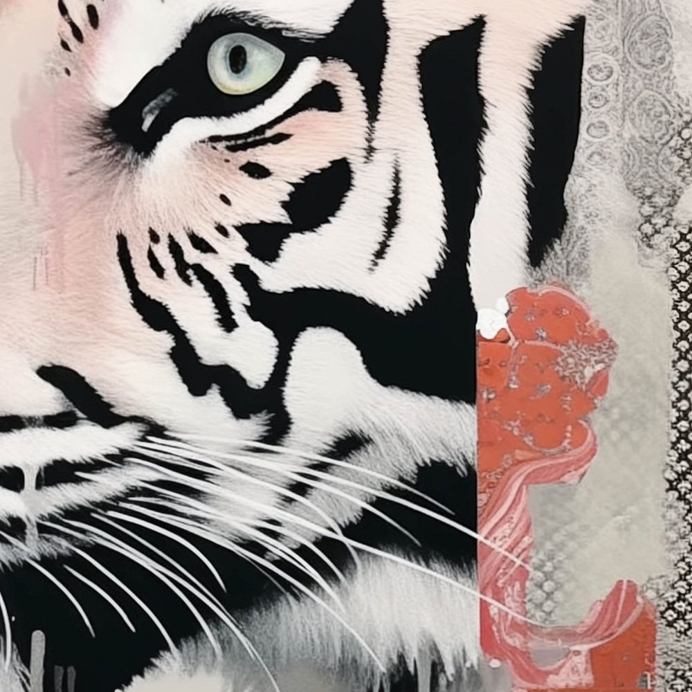 Combinant le portrait réaliste d'un tigre blanc avec des éléments abstraits et graphiques, y compris des gouttes de peinture et des couches à motifs, créant un contraste entre le sauvage et le cultivé.