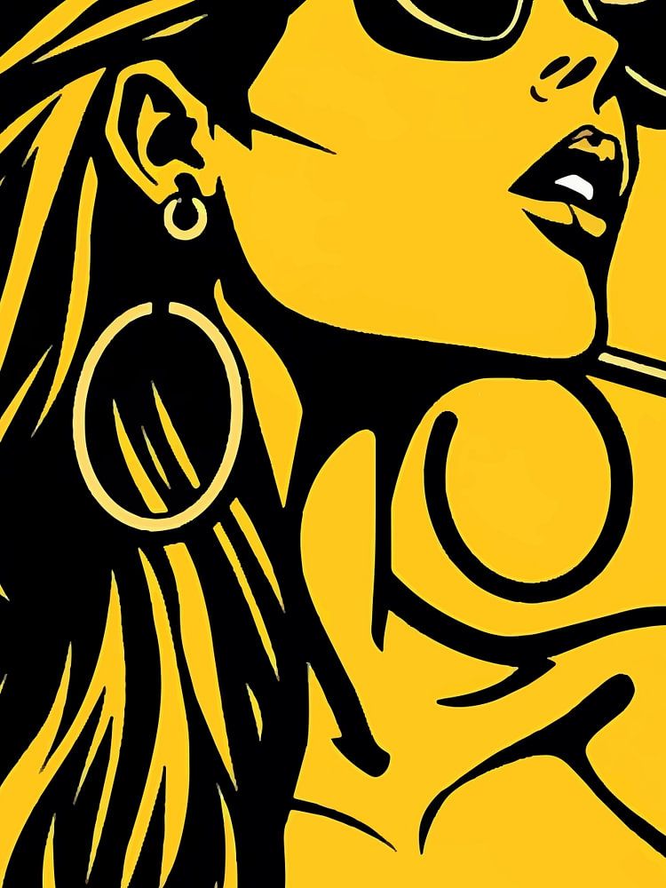 Illustration d'une femme à la mode portant des lunettes de soleil et fumant, sur un fond texturé orange et jaune créant un effet rétro.