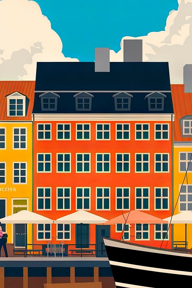 Dans un quartier portuaire animé, des façades colorées s'épanouissent tandis qu'un bateau pittoresque se balance doucement sur l'eau. De jolies fleurs ornent la rive et invitent à la détente. Une chaise solitaire, placée au soleil, invite à la rêverie et renvoie à la charmante sérénité de Copenhague. Ici, l'histoire et le présent se mélangent en parfaite harmonie.