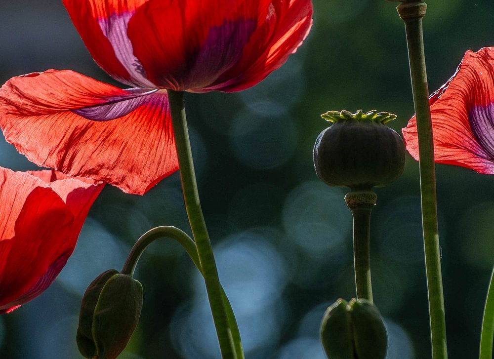 Ces coquelicots sont éclairés par la douce lumière du matin. Le rouge et le violet se renforcent mutuellement et constituent un ajout coloré au mur de votre maison ou de votre bureau.