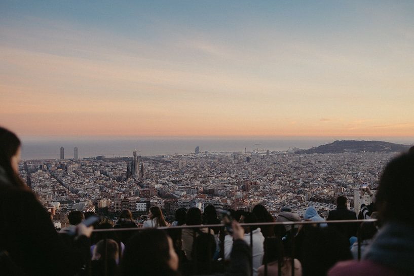 Profitez du coucher de soleil sur Barcelone en compagnie d'une foule, avec vue sur la ville et la mer. La ville est loin de s'arrêter, la vie nocturne est sur le point de commencer. Le ciel prend toutes les couleurs chaudes à la fois. Encore quelques minutes et toutes les lumières s'allumeront.