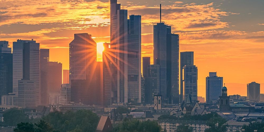 Coucher de soleil sur le Mainhattan de Francfort, le quartier central des affaires de Francfort, en Allemagne. Le mot est un portmanteau de Main, le fleuve sur lequel se trouve Francfort, et de Manhattan, une référence aux tours et aux gratte-ciel visuellement impressionnants du centre-ville.