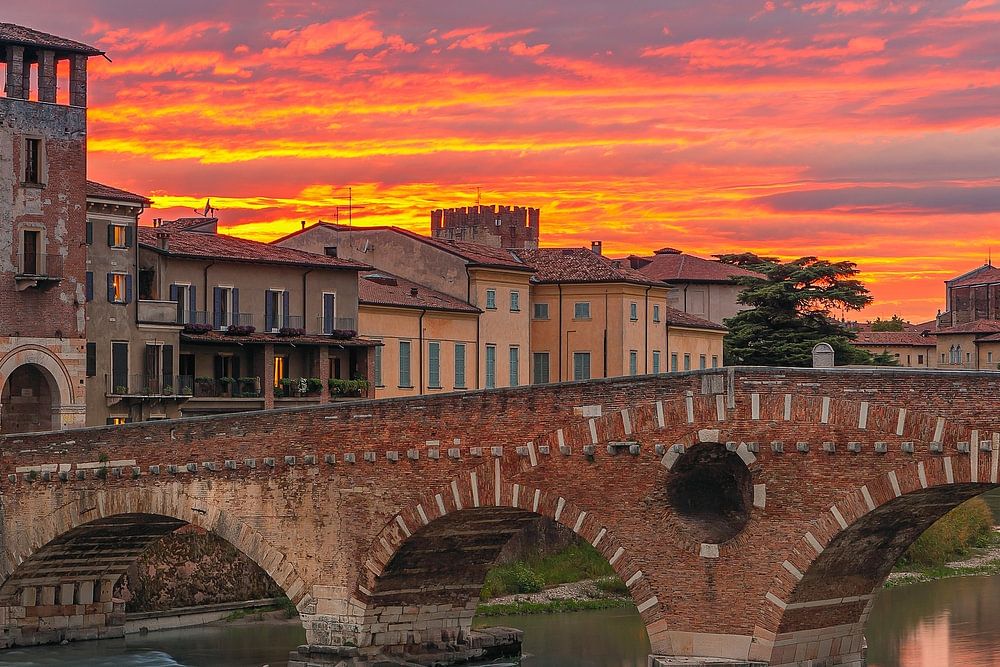 Le coucher de soleil sur le vieux pont historique de Ponte Pietra à Vérone, sur le fleuve Adige, dans la province de Vénétie, en Italie.