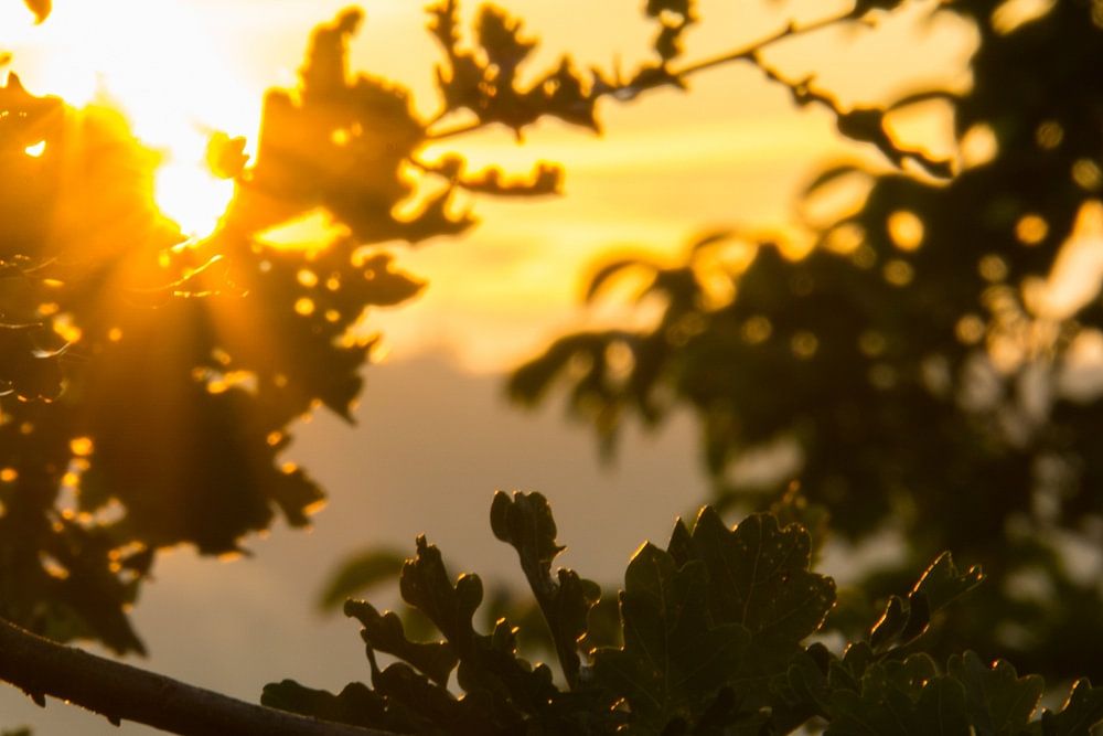 A propos de "Coucher de soleil d'automne avec une lumière orange chaude derrière des feuilles vertes"