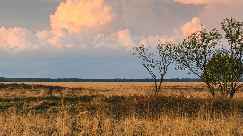 Une soirée au coucher du soleil sur le Kloosterveld dans le parc national Dwingelderveld, la plus grande lande humide d'Europe occidentale. Situé dans la province néerlandaise de Drenthe, dans le triangle Dwingeloo, Ruinen et Beilen. Les basses terres humides et les hautes crêtes de sable alternent dans le vaste Dwingelderveld. Vous y trouverez des landes, des bois, des buissons de genévrier, des sables mouvants et plus de quarante tourbières. Certains de ces étangs ont été créés pendant la période glaciaire, d'autres sont le résultat de l'excavation de la tourbe.