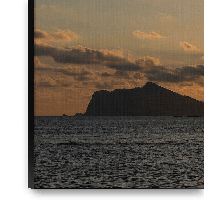 Coucher de soleil sur la côte méditerranéenne à Calpe, avec vue en direction de la ville côtière de Benidorm. Le paysage côtier est baigné de couleurs enchanteresses. La lumière dorée du soleil rencontre des nuages doux. Les derniers rayons du soleil de la journée sont discrètement reflétés par la surface ondulée de l'eau.