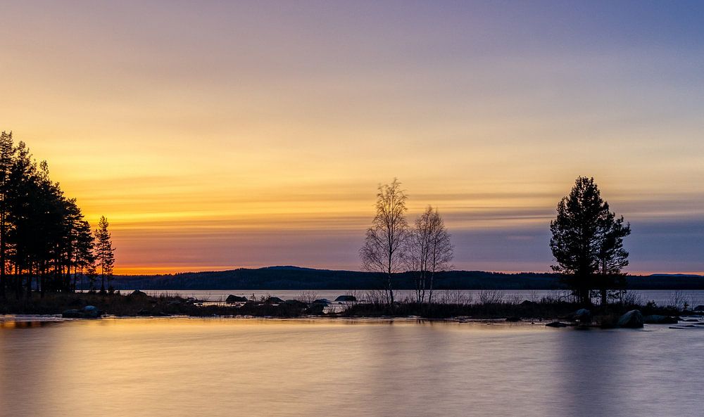 Un coucher de soleil glacé près de Falun en Suède, au lac Siljan. Nous sommes en plein hiver, mais sans neige. L'eau semble avoir quelque chose de tropical, mais elle n'est qu'à peine au-dessus de zéro degré.