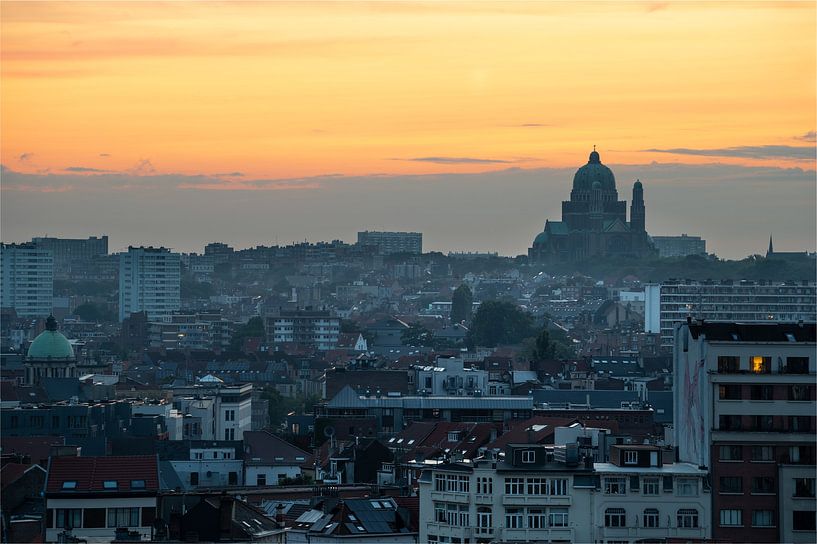 Bruxelles, Belgique, 20 juillet 2023 - Coucher de soleil jaune sur Molenbeek, Koekelberg et Ganshoren avec la Basilique du Sacré-Cœur en arrière-plan.