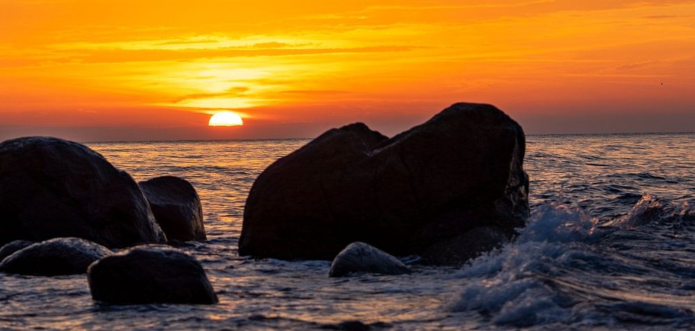 Coucher de soleil panoramique sur la plage avec de gros rochers dans l'eau sur la mer Baltique à Rügen