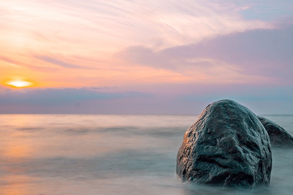 Coucher de soleil sur la plage ouest près d'Ahrenshoop sur la mer Baltique. Fischland Zingst Darß, Mecklembourg-Poméranie occidentale