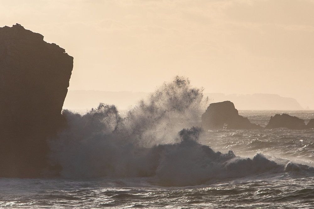 Coucher de soleil sur la côte nord de l'Espagne, dans la région des Asturies ! Les vagues se brisent sur les falaises et les rochers et le soleil colore tout en or pendant l'heure dorée !