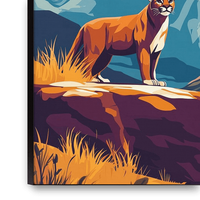 Cette œuvre montre un puissant couguar, se tenant fièrement sur un rocher, avec un paysage de montagne à couper le souffle en arrière-plan. Les lignes nettes et les couleurs vives donnent à la composition un aspect moderne et illustratif. Le puma respire la force et la vigilance, tandis que les montagnes à l'arrière-plan évoquent la…