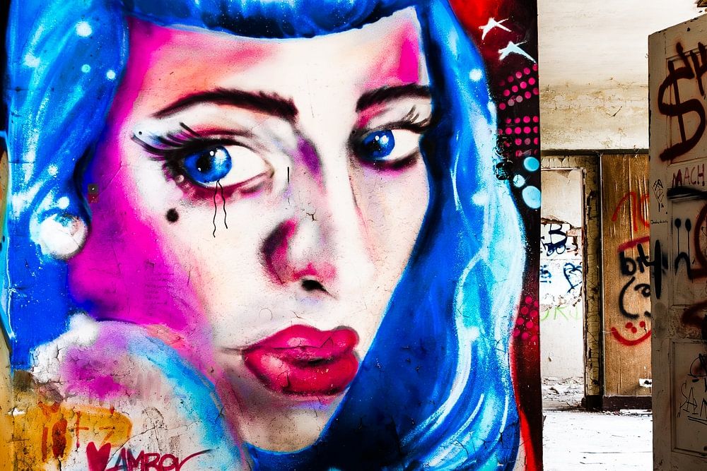 Au milieu d'un bâtiment abandonné, un portrait vivant en graffiti trône sur le mur. L'image montre le visage d'une femme aux cheveux d'un bleu éclatant et aux yeux d'un bleu profond, mélancoliques et intenses. Des couleurs vives comme le rose, le bleu et le rouge se détachent des murs qui s'effritent et du délabrement environnant, créant un contraste fascinant entre l'art et la dégradation. Les autres graffitis et gribouillages de la pièce racontent leurs propres histoires, tandis que la lumière passe doucement à travers la porte ouverte, plongeant la pièce dans une lumière mystique, presque surréaliste. L'endroit donne l'impression d'être une retraite secrète, animée par l'art urbain, tout en dégageant un air de solitude.
