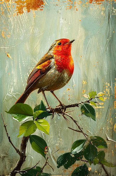 Un rouge-gorge est assis parmi des feuilles vertes fraîches et regarde autour de lui avec curiosité. Le contraste entre l'orange chaud de la poitrine et les tons froids du vert donne à cette œuvre un caractère vivant et frais. Cette œuvre fait partie de la série Couleurs du rouge-gorge, qui représente l'oiseau dans différents états…