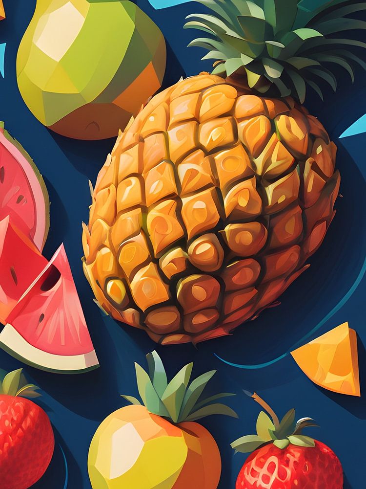 Cette œuvre d'art capture l'essence vibrante des fruits tropicaux avec un attrait visuel saisissant. La composition se compose d'ananas, d'oranges, de fraises et de citrons colorés, placés sur un fond bleu profond qui met en valeur les couleurs vives des fruits. Les formes géométriques et les lignes nettes et définies rappellent le style du modernisme, tandis que les éléments ludiques ajoutent une touche de pop art à l'œuvre.
