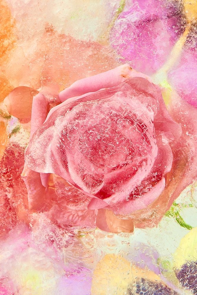 Les fleurs ont été mises dans l'eau et congelées. Puis saupoudré et recongelé pour obtenir le meilleur résultat de douces nuances pastel, de couleurs fraîches, de détails fins et de transparence des pétales. Il s'agit d'une photographie et aucun artifice ou peinture n'a été utilisé pour obtenir le résultat final ; un bouquet de simplicité, de nature et de couleurs estivales.