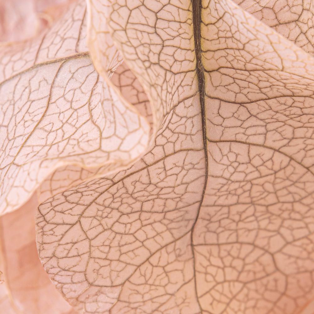 "Couleurs pastel : rose tendre - pétales beiges" ; est une photo macro de belles feuilles d'une plante à Lanzarote. Ces feuilles sont tombées de la plante et se sont déjà partiellement décomposées. Par conséquent, vous pouvez voir la belle structure des nervures des feuilles. C'est sur la feuille supérieure, au milieu, que l'on voit le mieux cette structure veineuse.