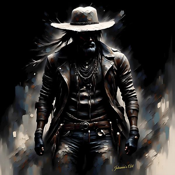 L'arrière-plan est animé de coups de pinceau dynamiques, balayés et superposés d'une manière qui traduit le mouvement et l'intensité, contrastant fortement avec la solidité de la figure du cow-boy. Ces coups de pinceau abstraits et énergiques accentuent l'effet dramatique, créant un sentiment de tension et de vitalité qui donne à la composition une allure presque cinématographique. La lumière et l'ombre jouent sur ses vêtements et ses traits, accentuant la texture et la forme, tandis que le mouvement de la toile de fond souligne la présence inébranlable du cow-boy au milieu du chaos.