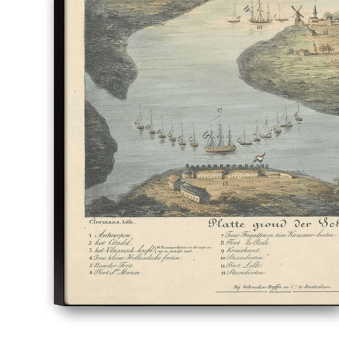 Achetez Cours de l'Escaut de Fort Bath à Anvers, 1832, J.B. Clermans en tant que reproduction sur toile, aluminium, ArtFrame ou photographie (encadrée), impression d'art en haute qualité et tout format