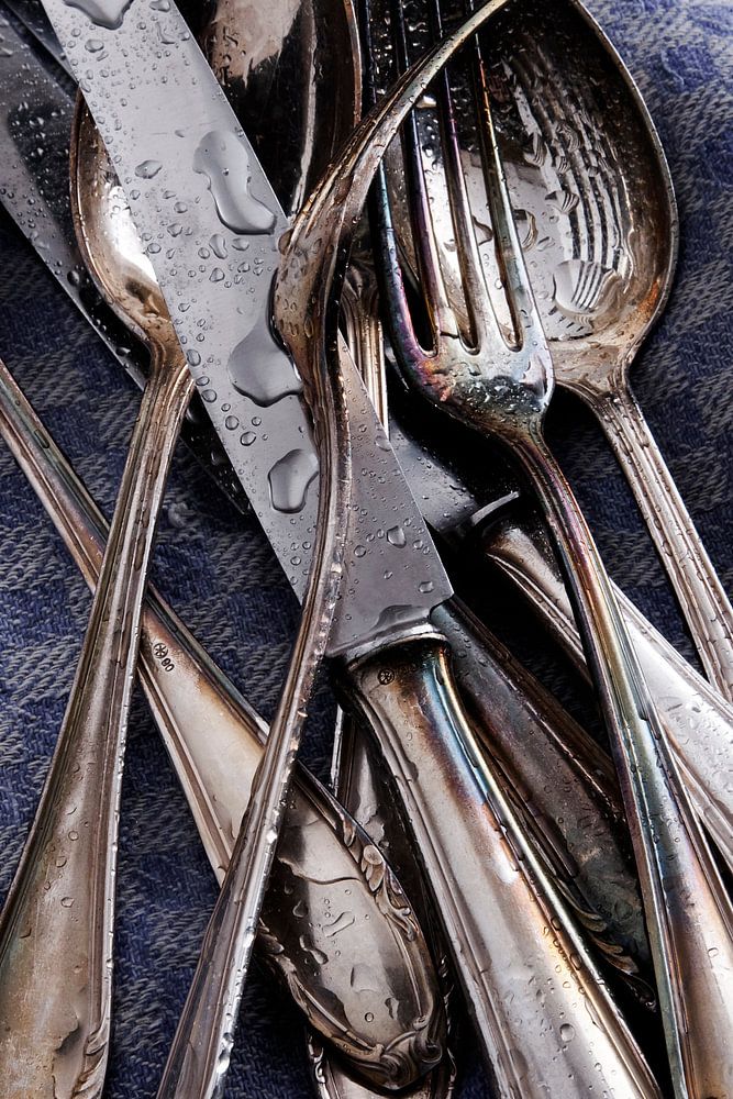 vieux couverts en argent terni avec des perles d'eau sur un torchon