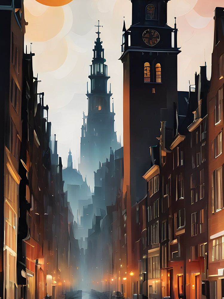 Cette œuvre d'art capture l'essence d'un canal d'Amsterdam au coucher du soleil, avec la chaude lueur du soleil couchant se reflétant sur les façades historiques et les eaux calmes. La composition est une ode moderne à la technique impressionniste avec une touche de surréalisme, les reflets et les jeux de lumière ayant une qualité presque onirique. L'utilisation de l'abstraction géométrique dans le rendu de l'eau et du ciel introduit des éléments de cubisme, offrant une profondeur complexe et un nouveau regard sur les paysages urbains traditionnels.