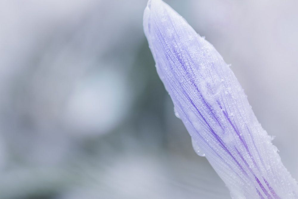 Un crocus qui montre parfaitement la transition entre l'hiver et le printemps. D'un côté, il gèle, de l'autre, il est déjà en train de dégeler.