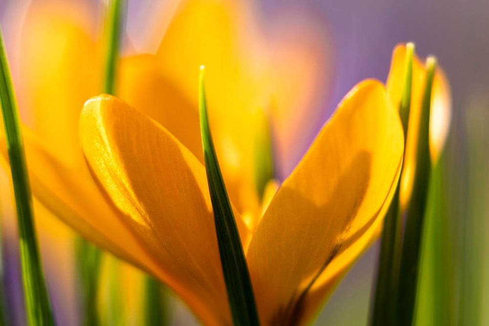 Un champ plein de crocus, jaunes, violets et blancs.