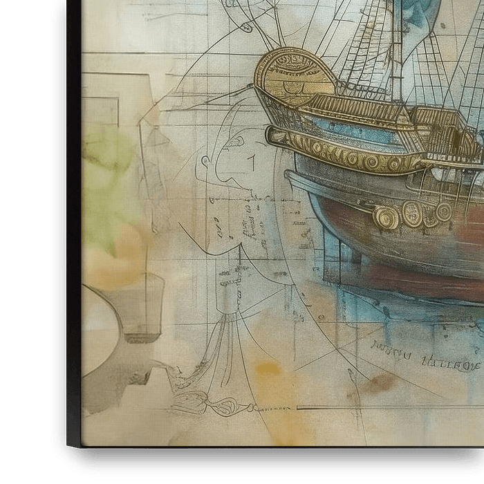 Ce dessin atmosphérique d'un navire historique aux voiles bleues respire la créativité et le savoir-faire. Une scène intemporelle qui suscite la curiosité et l'imagination. Parfait pour les intérieurs classiques, vintage, éclectiques et design, il constitue un choix élégant pour un salon, un bureau, une entrée ou un coin détente.