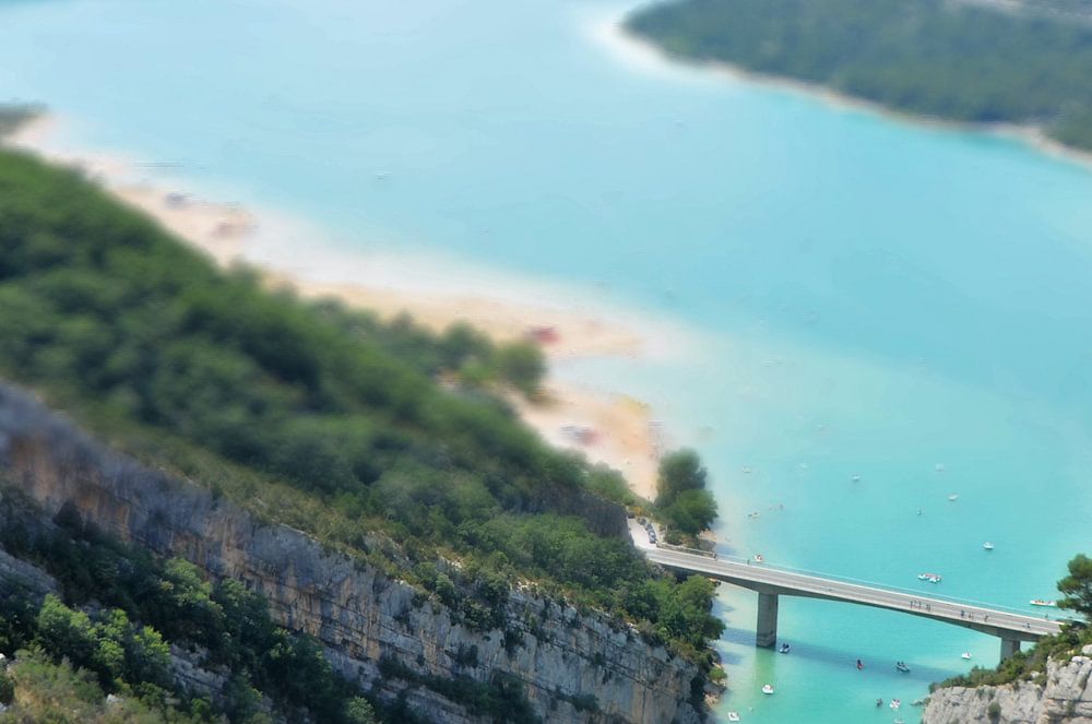 Deze brug langs het prachtig blauwe meer Lac du Sainte-Croix in het zuiden van Frankrijk vormt de poort naar de Gorges du Verdon. De rivier De Verdon mondt hier uit in het meer.