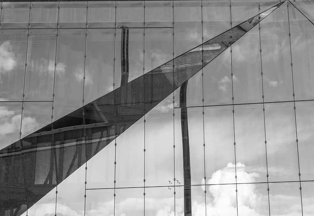 Prise de vue en noir et blanc du Cube à Berlin avec le reflet de la ville dans les fenêtres.