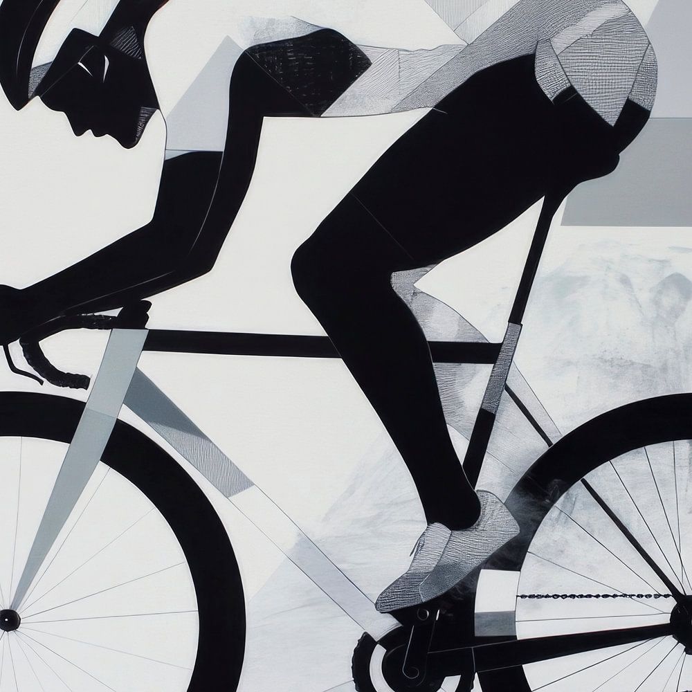 Un personnage dynamique file à une vitesse impressionnante à travers une composition géométrique de triangles et de cercles. Les couleurs noires et blanches renforcent l'impression de mouvement et d'énergie. L'athlète est saisi dans une posture aérodynamique alors qu'il se dirige vers la ligne d'arrivée avec une concentration totale - un symbole de changement et de détermination.