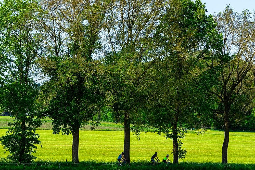 Paysage avec rangée d'arbres et cyclistes - dans la vallée de Vecht près de Beerze en Overijssel