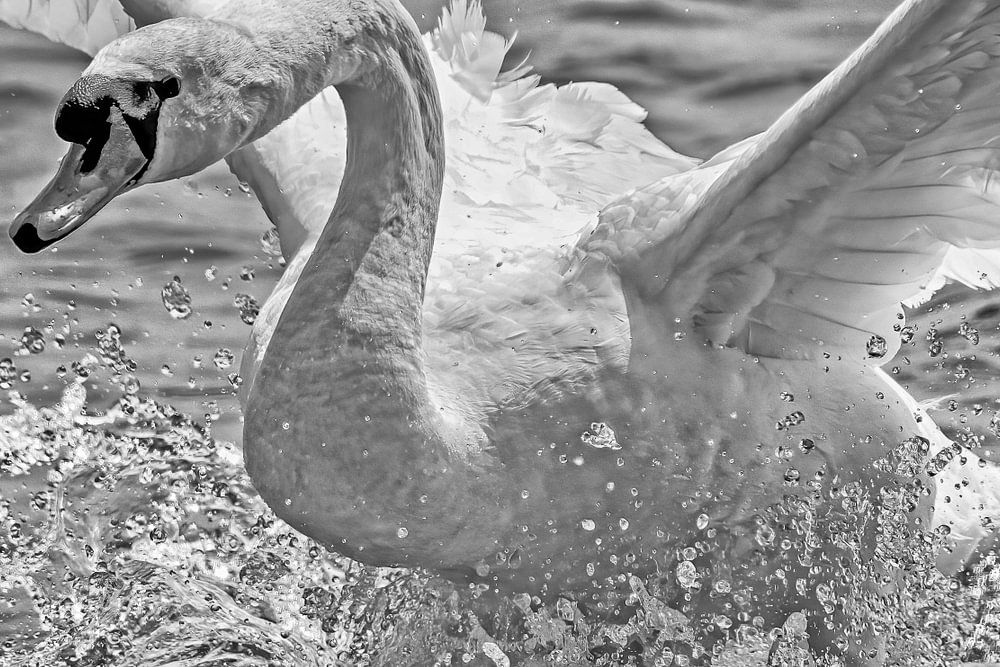 Cygne se posant sur un lac, surfant sur ses pattes en faisant éclabousser l'eau. Juste avant cela, ce cygne en poursuivait un autre. L'atterrissage de cet énorme oiseau est un spectacle magnifique et une source d'inspiration pour le capturer. Il donne l'impression d'être dans un polder.