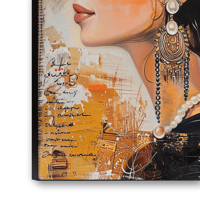 Elegant Lady - Cette peinture de femme représente une élégante dame aux yeux fermés, richement décorée de bijoux en or et d'un fond multicolore qui respire la douceur et la force.
