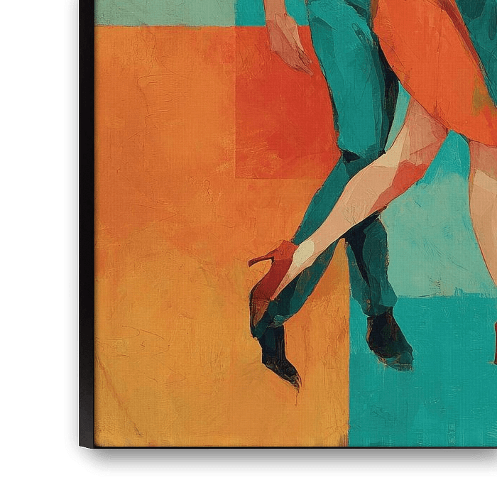 Dance Vibes - Ce tableau de danse énergique montre un homme et une femme debout dans une pose intime, la femme étant vêtue d'une robe colorée et l'homme d'un chemisier aux couleurs vives, entourés d'un arrière-plan ludique aux couleurs vibrantes telles que l'orange et le turquoise.