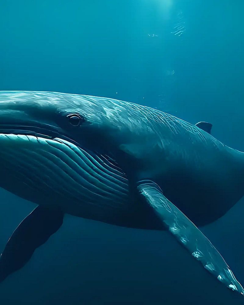 Nageur expérimenté, la baleine glisse avec grâce dans l'eau, quittant parfois l'air d'un bond vigoureux avant de replonger avec élégance dans les profondeurs. Le bruit de sa respiration, qui semble être une légère soufflerie de brouillard, se mêle au doux clapotis des vagues. Autour de lui, de petits poissons jouent et dansent en bancs chatoyants à travers la surface étincelante de l'eau.