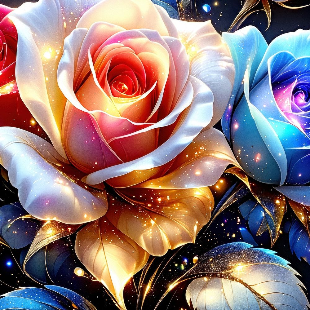 Cette peinture murale majestueuse élève la rose, la reine des fleurs, au rang d'ode impressionnante et invite le spectateur à s'imprégner de sa grâce intemporelle. Qu'elle soit utilisée seule ou dans le cadre d'un triptyque harmonieux, elle déploie toujours une gamme de couleurs exquise : Des roses rouges, blanches et bleu cobalt d'une intensité incandescente entrent en dialogue sensuel avec des nuances florales délicates, allant de l'ivoire au rose fin.