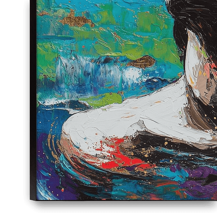 Portrait de femme puissant avec une explosion de couleurs et de textures. Le visage de la femme respire la liberté et l'abandon, avec des yeux fermés et une posture légèrement ascendante. Ses cheveux semblent sauvages et en mouvement, comme s'ils étaient entourés d'un vent ou d'une énergie invisible. L'arrière-plan vibrant, aux couleurs…