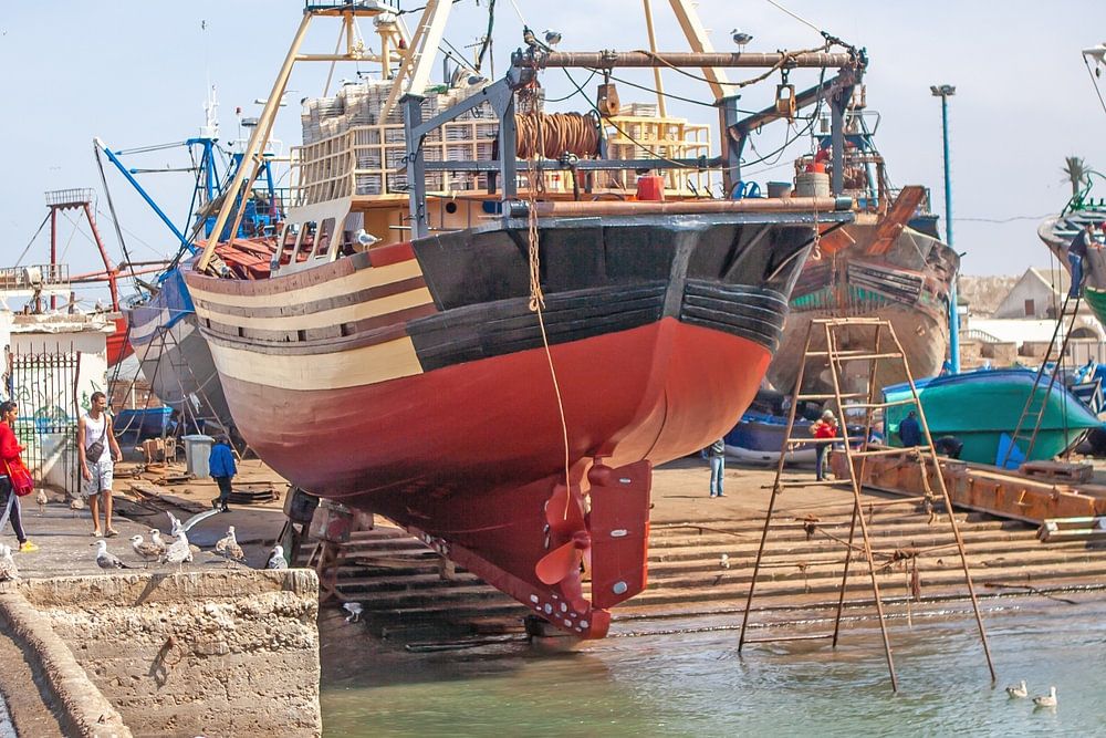 Essaouira est une ville portuaire de la côte atlantique du Maroc. La médina (vieille ville) est entourée de murs de fortification datant du 18e siècle, qui courent le long de la côte. Ils sont appelés Skala de la Kasbah et ont été conçus autrefois par des ingénieurs européens. Les murs sont bordés d'anciens canons en laiton et offrent une vue sur la mer. De puissants alizés assurent des conditions idéales pour le surf, la planche à voile et le kitesurf sur la plage en forme de croissant de la ville. La Citadelle d'Essaouira est une forteresse historique et un motif de photo populaire avec un port de pêche et un marché aux poissons actifs.