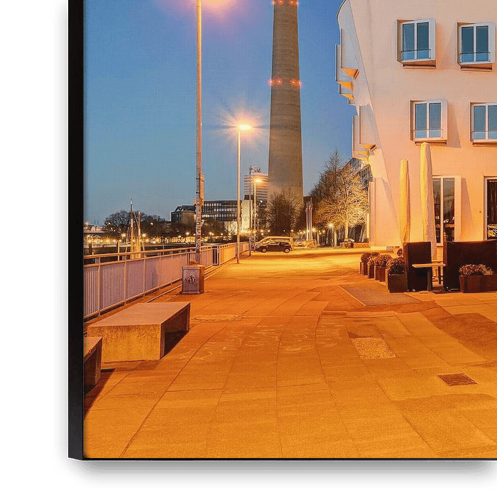 Vue sur l'un des trois bâtiments de Gehry au Neuer Zollhof dans le port des médias de Düsseldorf et sur la Tour du Rhin en arrière-plan. Après le crépuscule, la place est baignée d'une lumière orange.