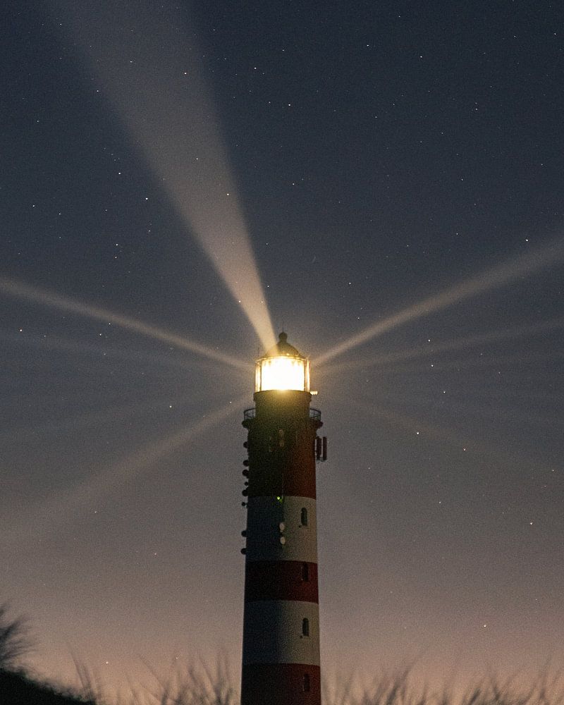 Dans toutes les directions, les rayons du phare d'Amrum s'étendent. Une vue carrée d'une silhouette typique depuis la mer.